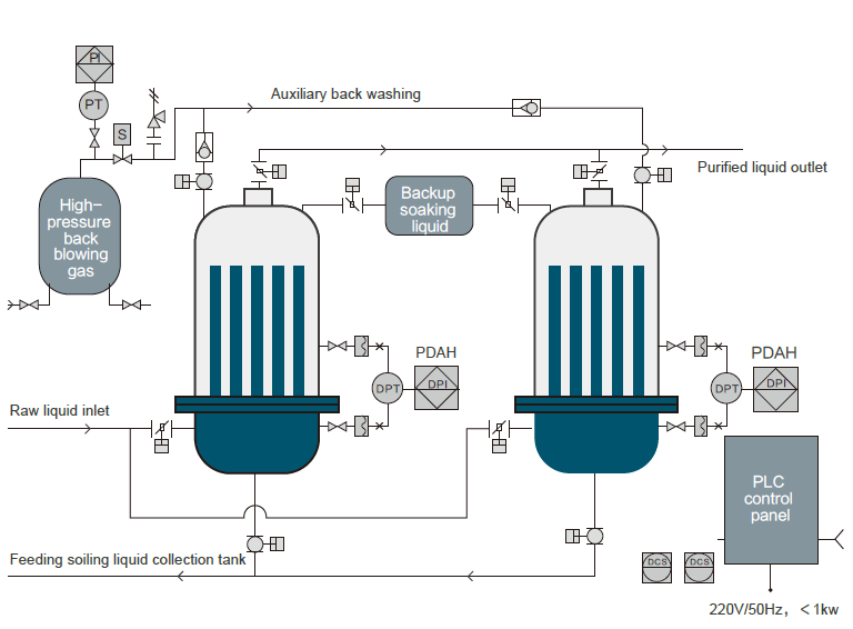 When the fluid is passing through filter cartridges, the solid particles will be retained on the outer surface of the filter cartridges to form filtration cakes, increasing the differential pressure before and after the filtration. When the differential pressure reaches preset value, the program controller will be activated to conduct automatic back washing in the following way:
